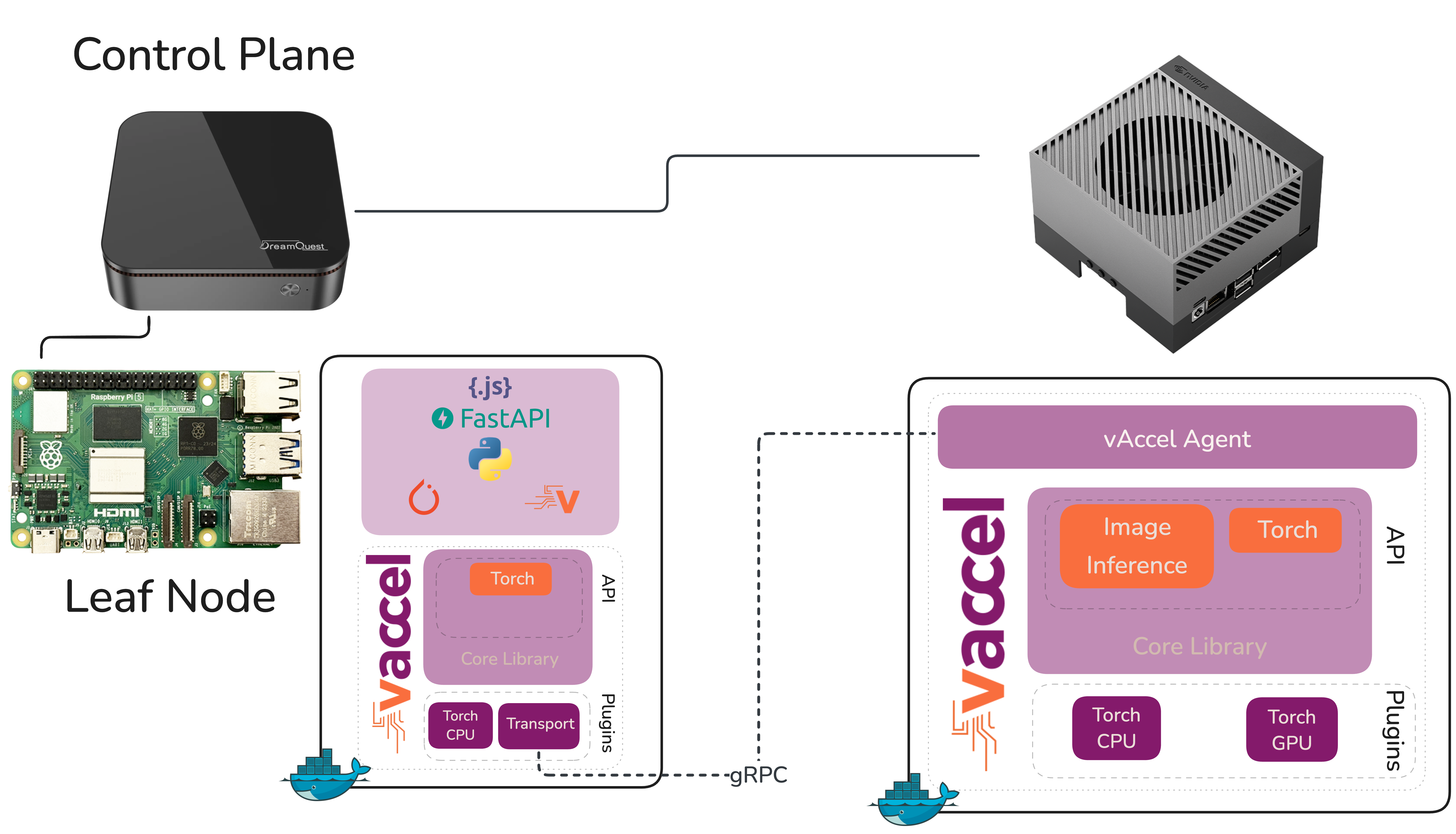 The demo flow goes like this: the object detection workload deploys and runs locally on the Raspberry Pi. As the Pi starts to struggle, frame rate drops, inference latency climbs, the MLSysOps agents picks this up through telemetry and transparently switches the vAccel backend to point at the Jetson AGX Orin. Suddenly the workload is offloaded to serious GPU hardware, real-time object detection kicks-in, and the policy change is the only thing that made it happen. No redeployment, no manual intervention. That’s the story we want to tell.