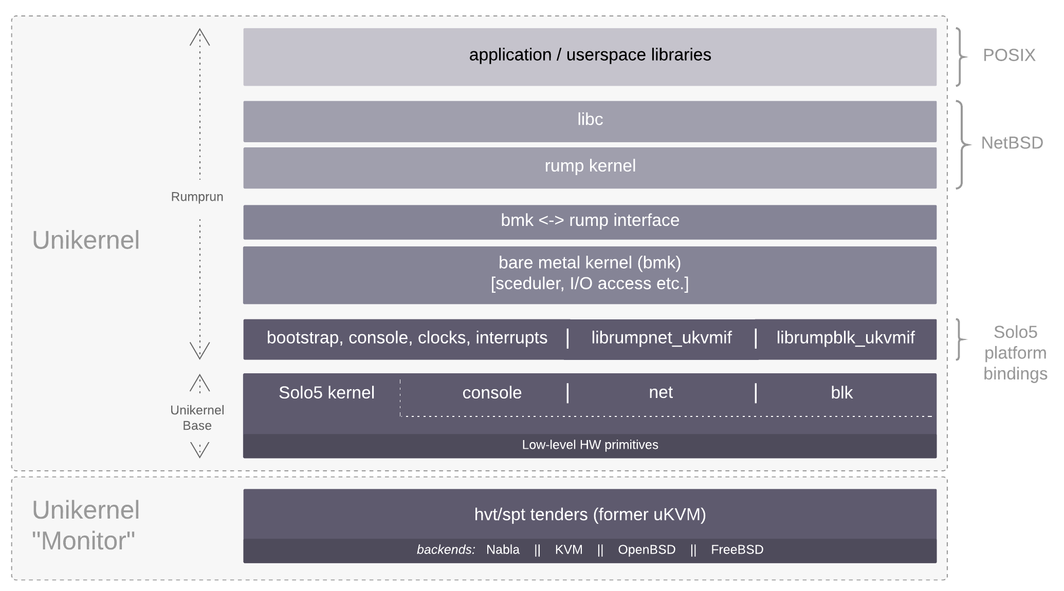 The Nabla fork of Rumprun provides a new unikernel target, Solo5. Solo5 is, essentially, a hardware abstraction layer that provides a very thin interface, or else a minimal attach surface. Its purpose is to facilitate the port of libOS/unikernel frameworks on various hardware platforms, i.e. a unikernel that runs on top of Solo5, runs on top of all the hardware targets, or tenders, using the Solo5 terminology, supported by Solo5.